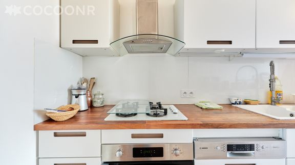 - Une cuisine équipée avec notamment : bouilloire électrique, machine à café filtre, four, four à micro-ondes, grille-pain, lave-vaisselle, plaques de cuisson...