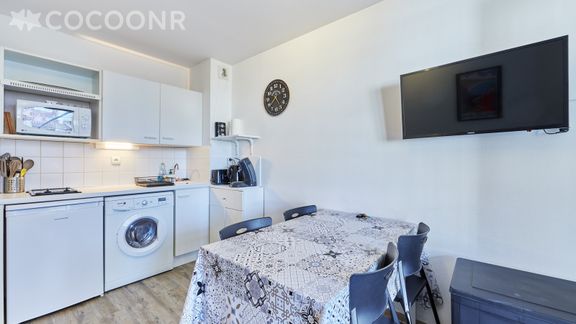 - Une cuisine, ouverte sur le séjour, équipée avec notamment : bouilloire électrique, four à micro-ondes, grille-pain, plaques de cuisson...