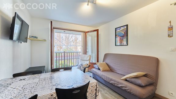- Une pièce de vie de 12 m² avec TV, canapé-lit double et coin repas