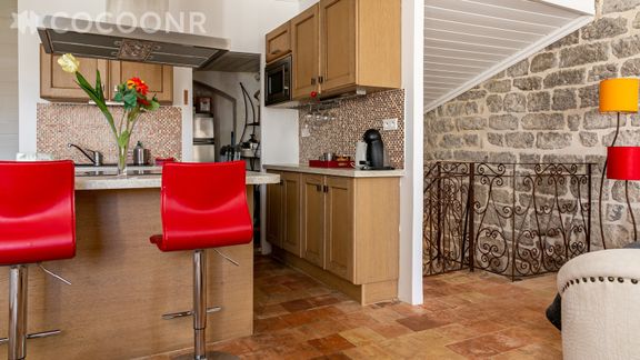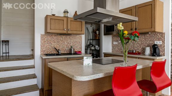 - Une cuisine ouverte sur la pièce de vie et entièrement équipée : îlot central avec deux tabourets, réfrigérateur, lave-vaisselle, four, plaques à induction, micro-ondes, grille-pain, bouilloire, cafetière à dosette Dolce Gusto..