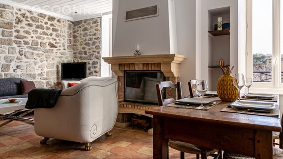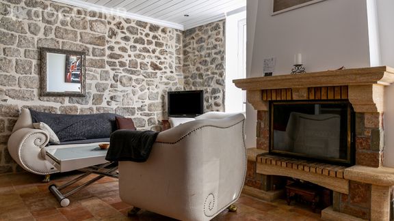 - Une belle pièce de vie lumineuse avec un coin salon doté d'un canapé, de deux fauteuils, d'une table basse, une TV et une grande cheminée (bois non fourni) ainsi qu'un espace repas avec une table à manger conviviale pouvant accueillir jusqu'à 4 personnes.