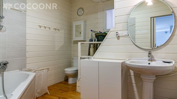 - Une salle de bain avec une baignoire d'angle, une vasque, un sèche-cheveux et un WC.