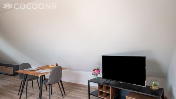 - Une pièce de vie de 21 m² ouverte sur la cuisine, espace repas, TV, et un canapé-lit simple (130*190).
