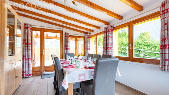 - Une pièce de vie de 22 m² au sein d'une véranda avec TV, lecteur DVD, canapé convertible (double), fauteuil et espace repas.