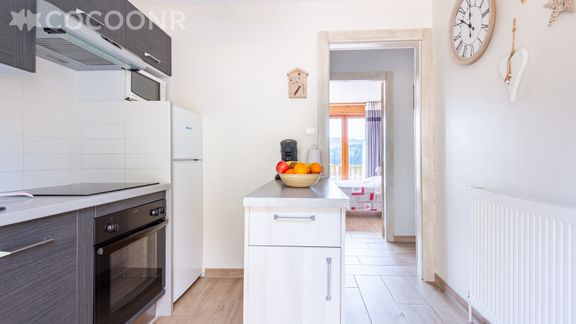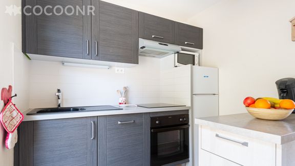 - Une cuisine équipée avec notamment : bouilloire électrique, grille-pain, four à micro-ondes, four, plaques de cuisson, réfrigérateur, lave-vaisselle, appareil à raclette-pierrade, cafetière à dosettes senseo...